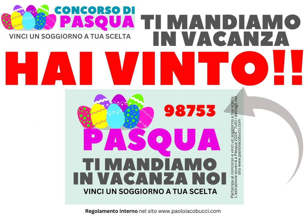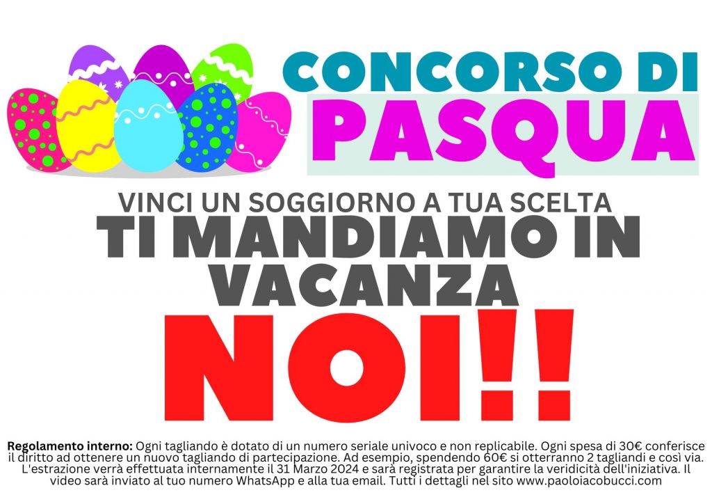 Organizzatore del Concorso: Il presente concorso, denominato “PASQUA – TI MANDIAMO IN VACANZA NOI!” è organizzato da PAOLO IACOBUCCI, nonché proprietario del punto vendita con P.iva 06459680580.