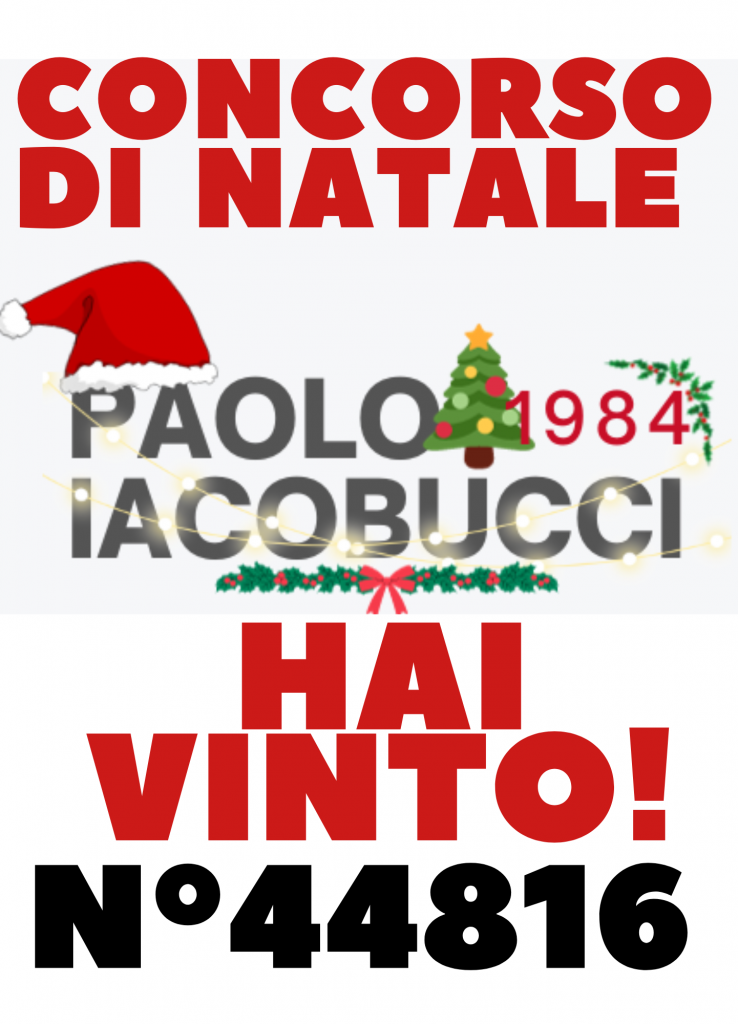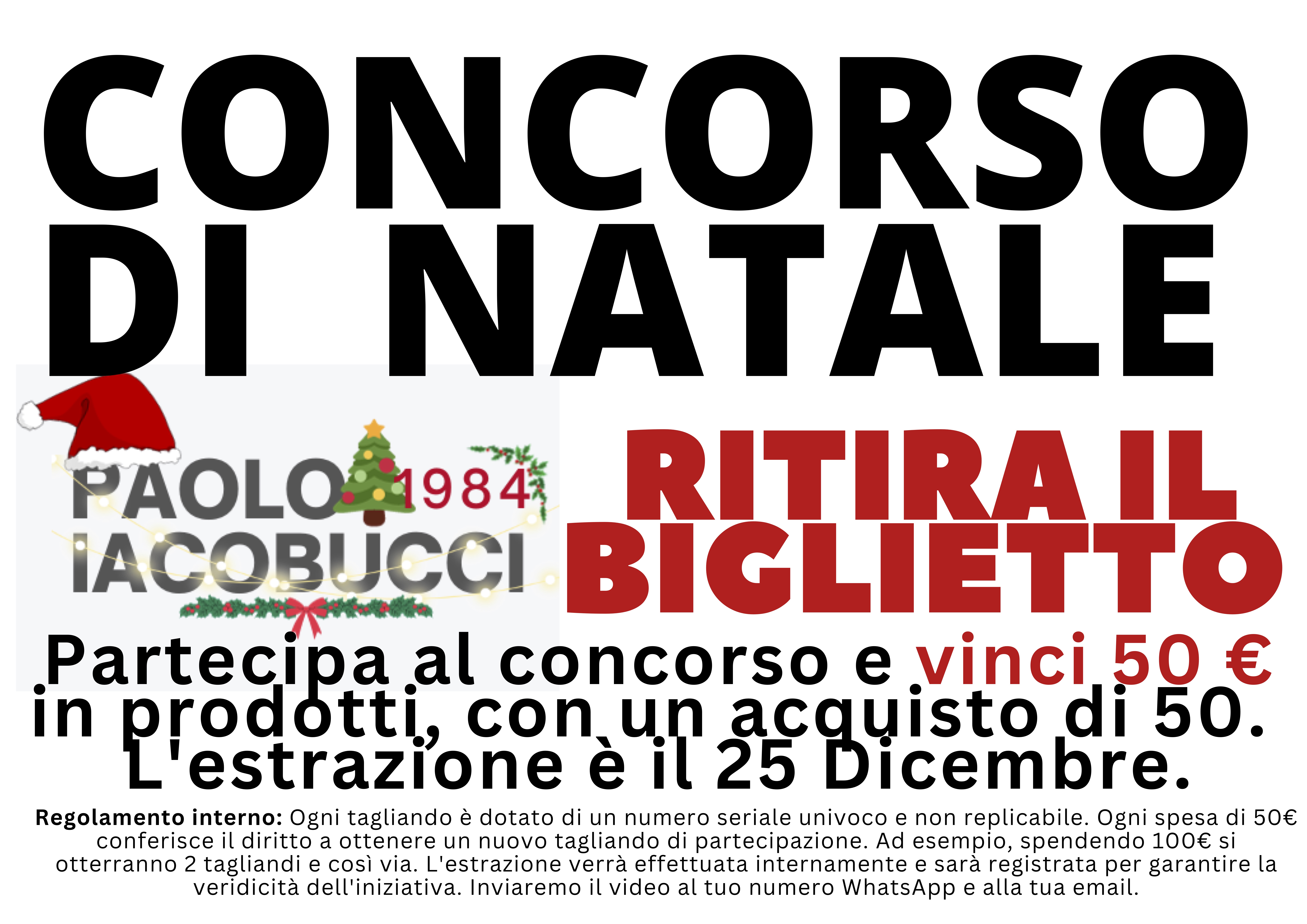 Modalità di Ritiro del Premio: Il vincitore potrà consumare il valore del premio presso il punto vendita Paolo Iacobucci entro la data di scadenza. Nel caso in cui il premio non possa essere ritirato personalmente, il vincitore può designare un rappresentante munito di tagliando vincente.